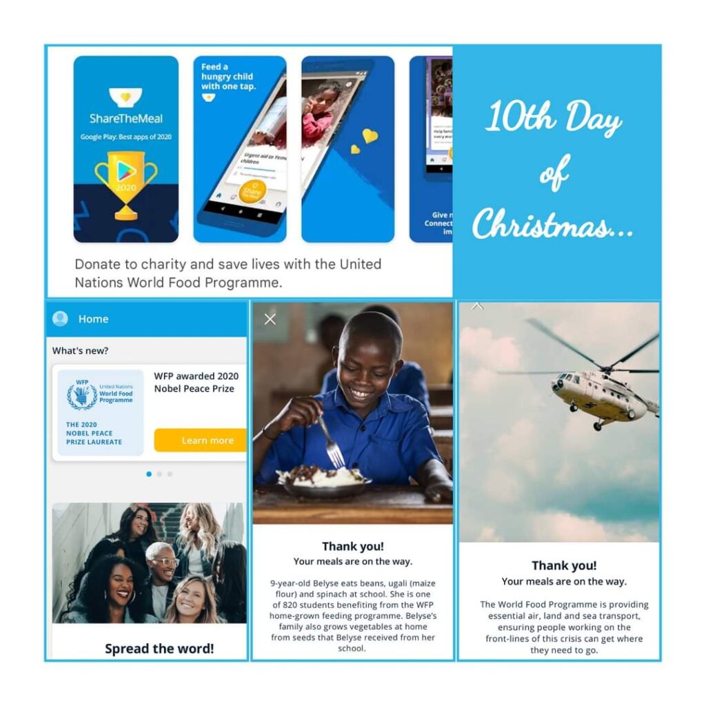 I found a fabulous app called Share The Meal. It is run by the United Nations World Food Programme (WFP) which won the 2020 Nobel Peace Prize.