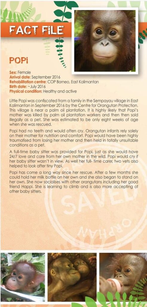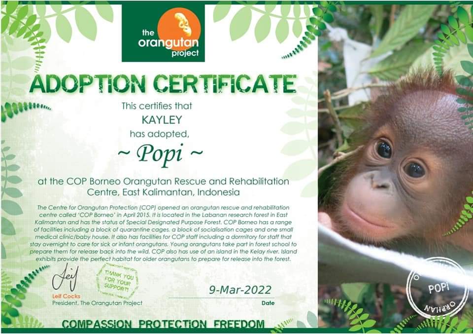 We adopted Popi in support of The Orangutan Project which supports the rehabilitation of orphaned Orangutans with the ultimate goal of releasing them back into a protected forest.